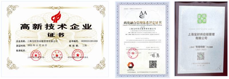 這些系統的研發和應用,不僅提升了寶時云倉的倉儲和配送效率,更為其打造服務復雜供應鏈的智慧云倉提供了堅實的基礎。專業的服務得到行業與客戶高度認可,寶時云倉先后榮獲上海市高新技術企業、上海市專精特新企業、兩化融合管理體系AA級評定證書。